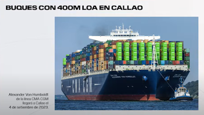 De este catálogo de grúas, actualmente el muelle tiene seis de color celeste, y una amarilla. En octubre incorporará tres azules y el próximo año dos verdes, las más grandes del mundo. Es decir, totalizará doce.Otra importante noticia es que el muelle ha quedado autorizado para recibir los buques más grandes del mundo, de 400 metros de eslora (largo) y capaces de transportar 21 mil TEU (contenedores de veinte pies de largo). Eso quedará confirmado con hechos el 4 de septiembre, con la llegada del Alexander Von Humboldt, de 396 metros de eslora y 53.6 de manga, y capaz de acarrear 16 mil TEU.El muelle también tiene buenas noticias en materia ambiental. Así, las quince grúas que recibirá en octubre serán eléctricas, y lo mismo ocurrirá desde febrero con todos los camiones y tractores que operarán en su patio. Esos vehículos serán alimentados por los paneles solares que instalará la empresa en los techos de sus edificios y otros lugares. Y en el nuevo rompeolas se instalará un aerogenerador eólico, cuya energía, conjuntamente con la proveniente de los paneles y de la red nacional (mayormente de fuente hidroeléctrica) será ofrecida a los buques, para que durante su estadía dejen de usar la de sus motores.