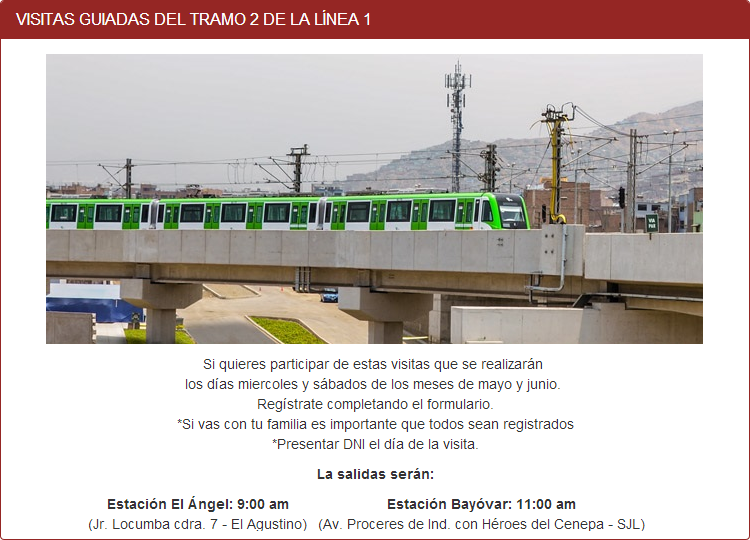 Para disfrutar de esta experiencia con la flamante infraestructura, basta inscribirse aquí, en la página de la AATE (autoridad encargada de supervisar el funcionamiento de este sistema de transporte). Las visitas serán a las 9 y 11 de la mañana de los días miércoles y sábado de mayo y junio. La partida será desde las estaciones de El Ángel y Bayóvar, puntos extremos del referido tramo.