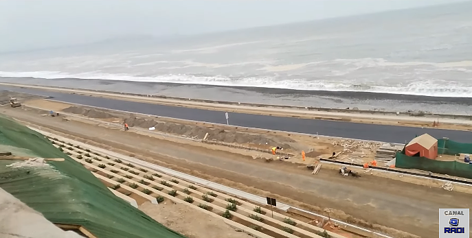 Allí se observa maquinaria pesada movilizando grandes rocas para poner a punto la escollera que protegerá la vía de los embates del mar. Eso viene ocurriendo unos metros al norte del viaducto Santa Rosa.Asimismo se constata que va quedando listo el terreno para las pistas, y que inclusive ya se inició el asfaltado de estas, a la altura del colegio militar Leoncio Prado, entre los viaductos Haya de la Torre y Santa Rosa.