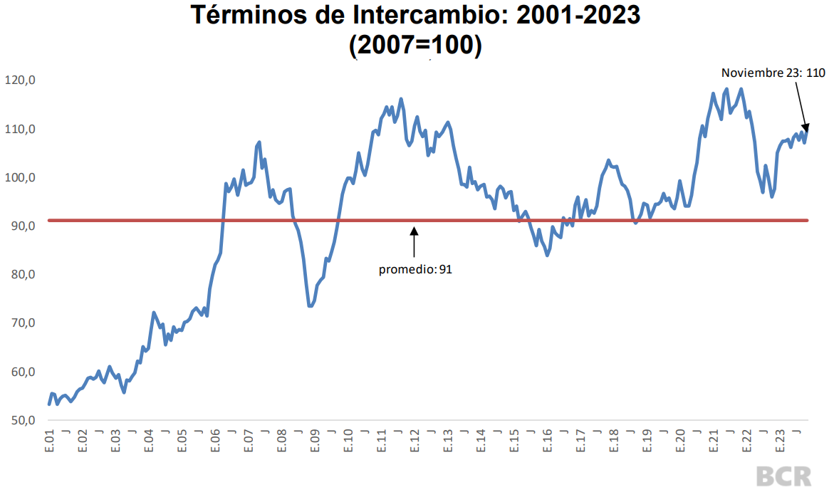 En noviembre del año 2023 los términos de intercambio aumentaron 12.5% frente a los de similar mes del 2022. Los precios de las exportaciones crecieron 5.8% y los de las importaciones decrecieron 6.0%. Fuente: BCR
